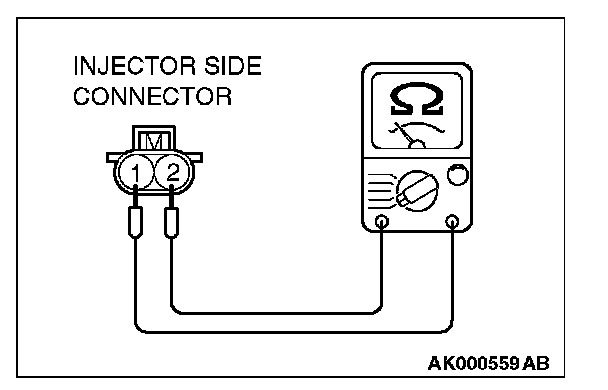 2. Measure the resistance between injector side connector terminal No. 1 and No. 2.