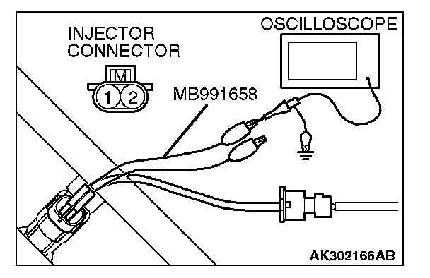 2. Connect the oscilloscope probe to the injector side connector terminal No. 2.