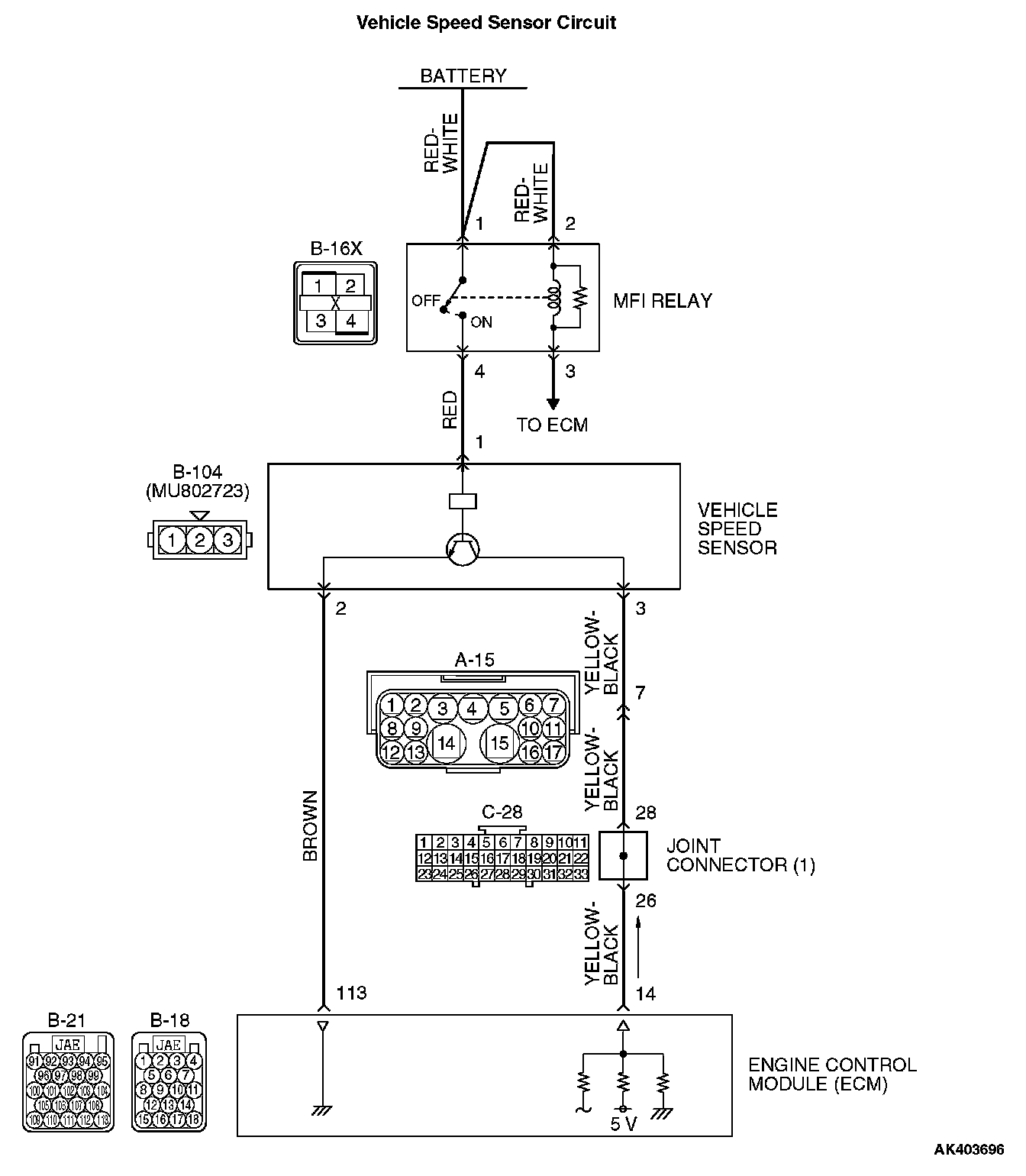 - A 5-volt voltage is applied to the vehicle speed sensor output terminal (terminal No. 1) from the ECM (terminal No. 14). The vehicle speed sensor generates a pulse signal when the output terminal is opened and grounded.