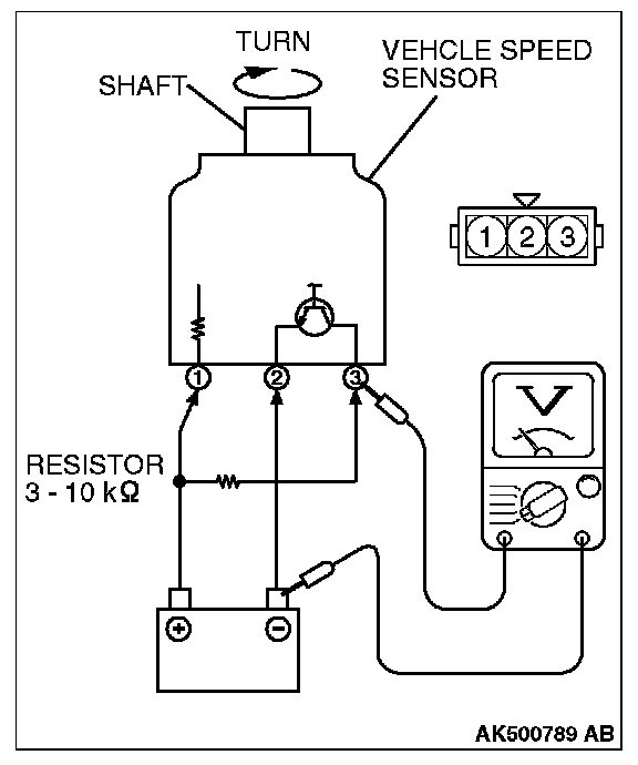 1. Remove the vehicle speed sensor and connect a 3 - 10 Kohms resistor as shown in the illustration.