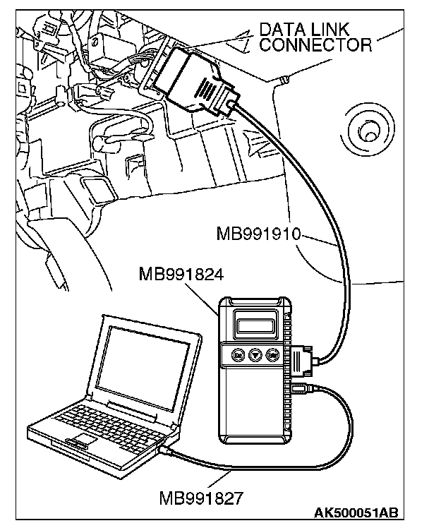 CAUTION: To prevent damage to scan tool MB991958, always turn the ignition switch to the "LOCK" (OFF) position before connecting or disconnecting scan tool MB991958.