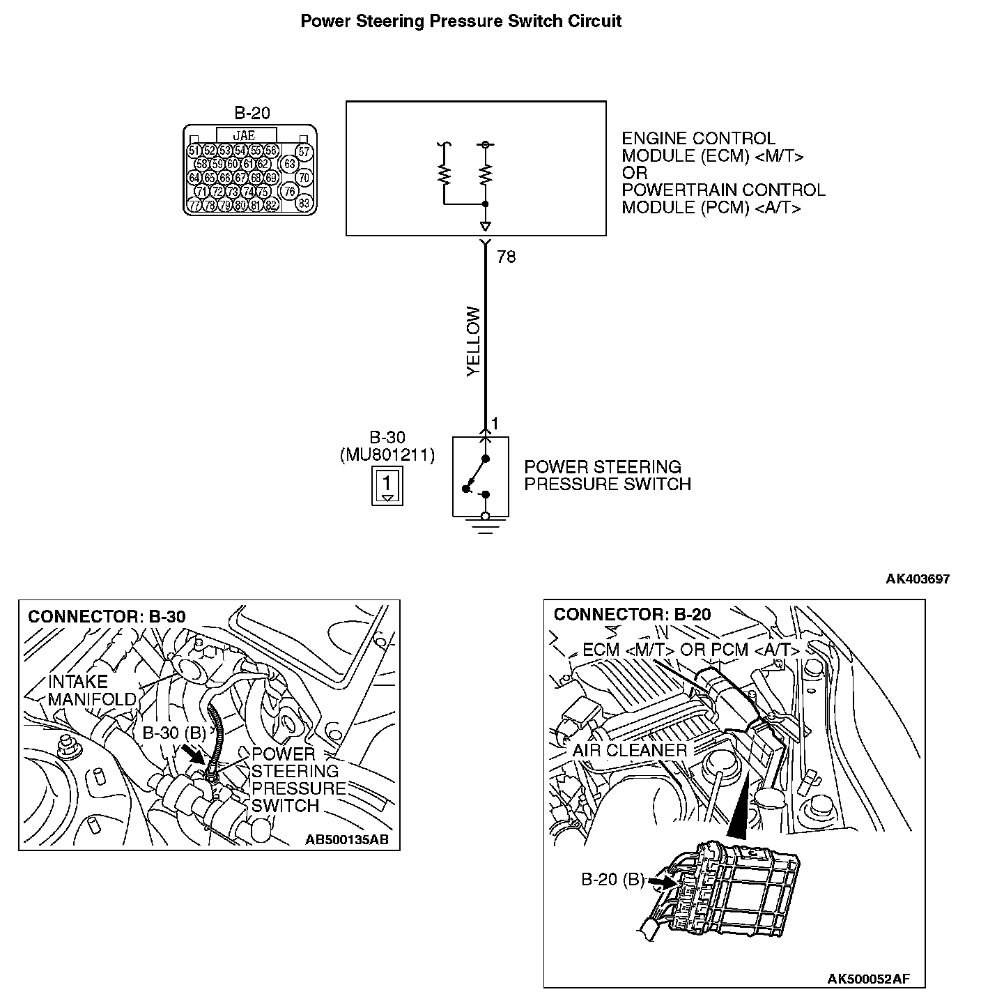 - Open or shorted power steering pressure switch circuit, harness damage, or connector damage.