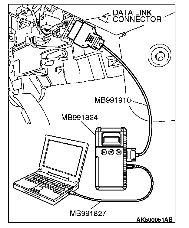 CAUTION: To prevent damage to scan tool MB991958, always turn the ignition switch to the "LOCK" (OFF) position before connecting or disconnecting scan tool MB991958.