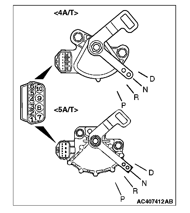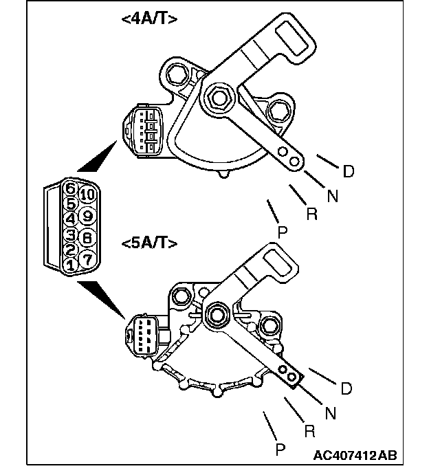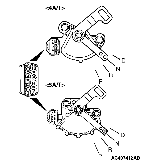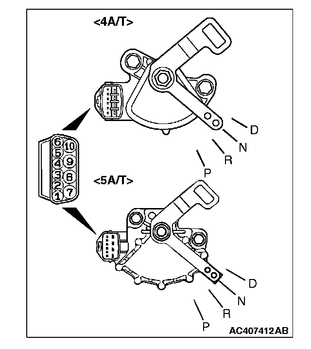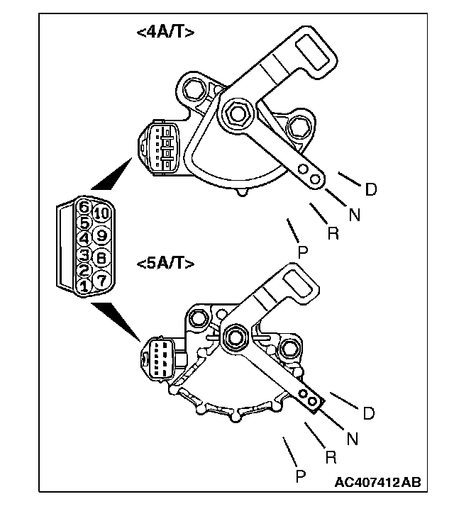 - Move the selector lever to "P," "R," "N," "D" and sport mode positions and confirm that the selected transmission range match the positions shown on scan tool MB991958.(The scan tool displays "D" range when the selector lever is shifted to the sport mode).