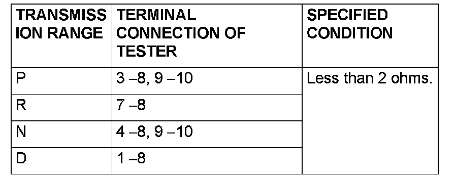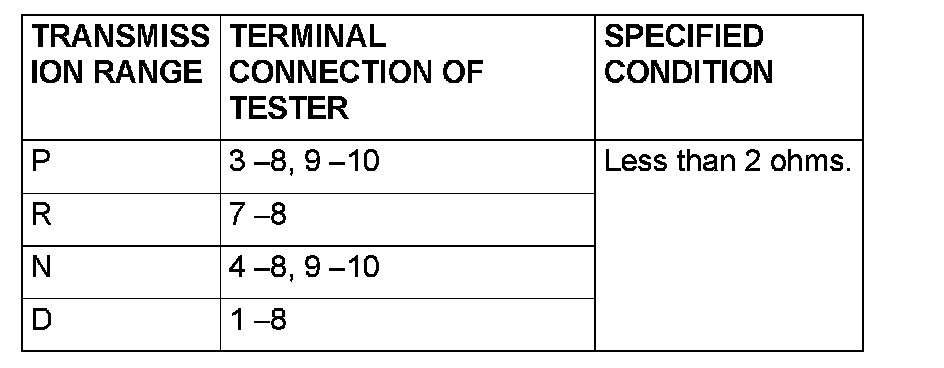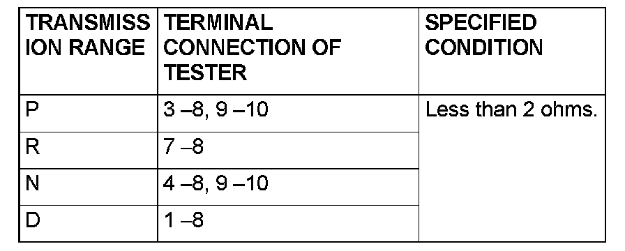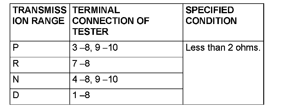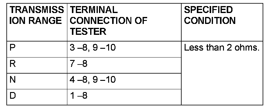 Measure the resistance between the terminals for each transmission range as indicated in the table below.