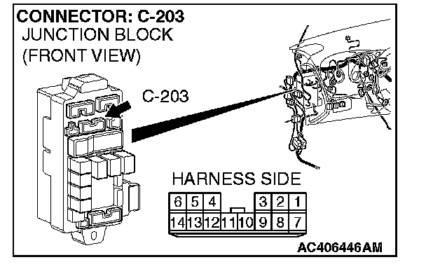 STEP 3. Check intermediate connector A-15, C-24, transmission range switch connector B-113, joint connector (1) C-28 and junction block connector C-203 for loose, corroded or damaged terminals, or terminals pushed back in the connector.