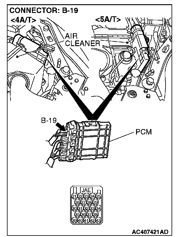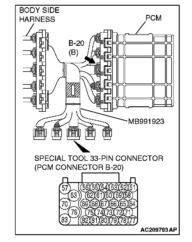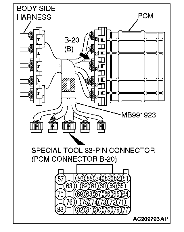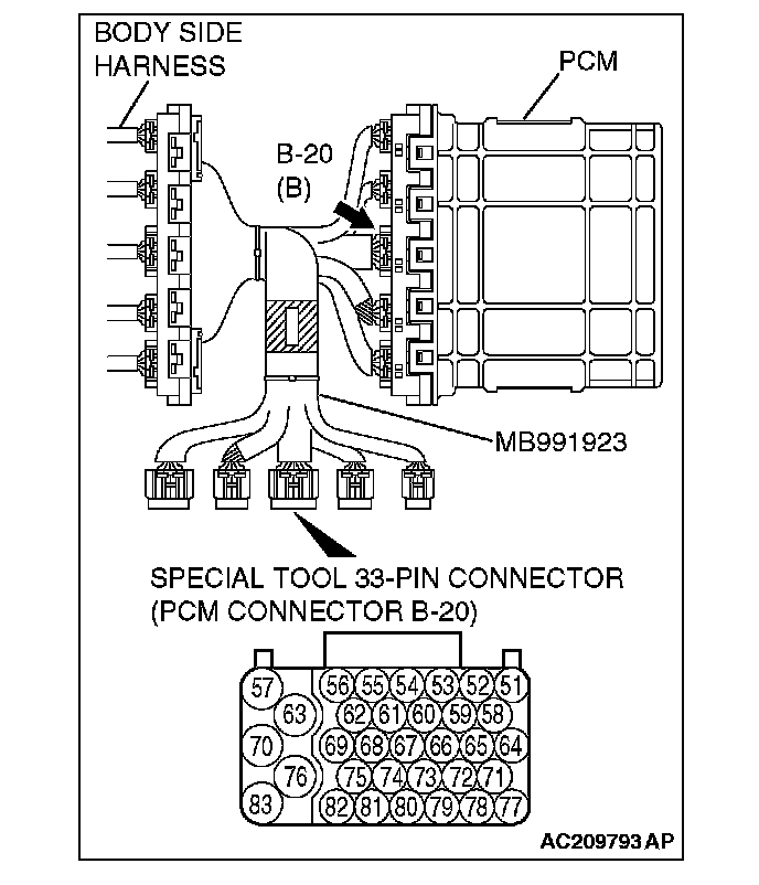 (2) Connect special tool MB991923 (check harness) between the PCM and the body-side harness connector.