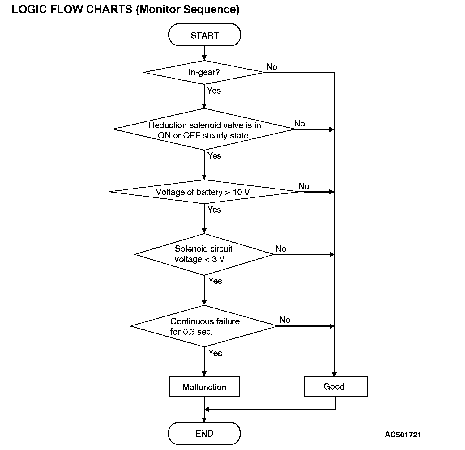 - If solenoid terminal voltage is below specified value when shift control is not in progress, PCM judges that reduction solenoid valve has a failure.