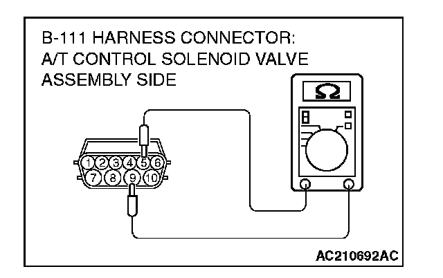STEP 13. Check the harness for an open or short circuit to ground between A/T control solenoid valve assembly connector B-111 (terminals 7, 6, 8, and 10) and solenoid valve connectors B-111-4, B-111-5 and B-111-6.