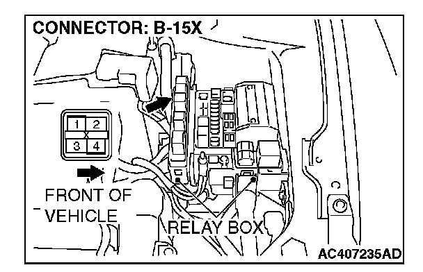 STEP 10. Check the harness for an open circuit or short circuit to ground between A/T control relay connector B-15X terminal 4 in the engine component relay box and A/T control solenoid valve assembly connector B-111 terminal 10.
