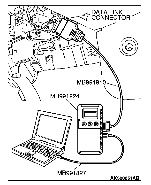 CAUTION: To prevent damage to scan tool MB991958, always turn the ignition switch to the "LOCK"(OFF) position before connecting or disconnecting scan tool MB991958.