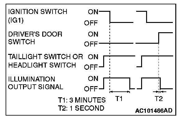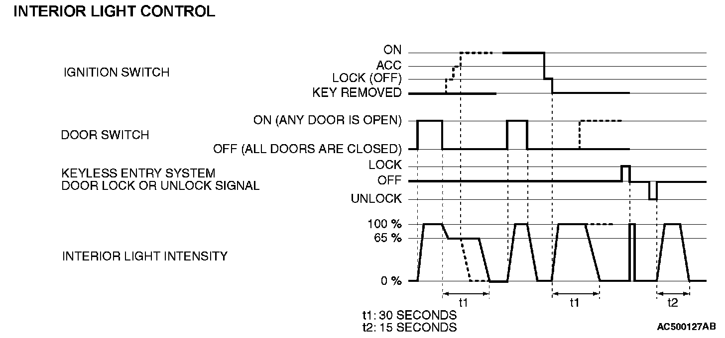 NOTE: The dotted lines indicate that lighting mode when the ignition switch is turned ON, door is locked, or any door is opened during the timer illumination time.