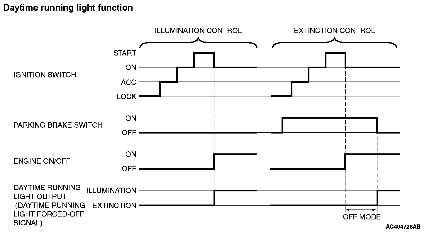 The ETACS-ECU outputs the daytime running light forced-OFF signal to the front-ECU based on the input signal sent via CAN communication. The front-ECU controls illumination and extinction of the daytime running light according to the daytime running light forced-OFF signal.