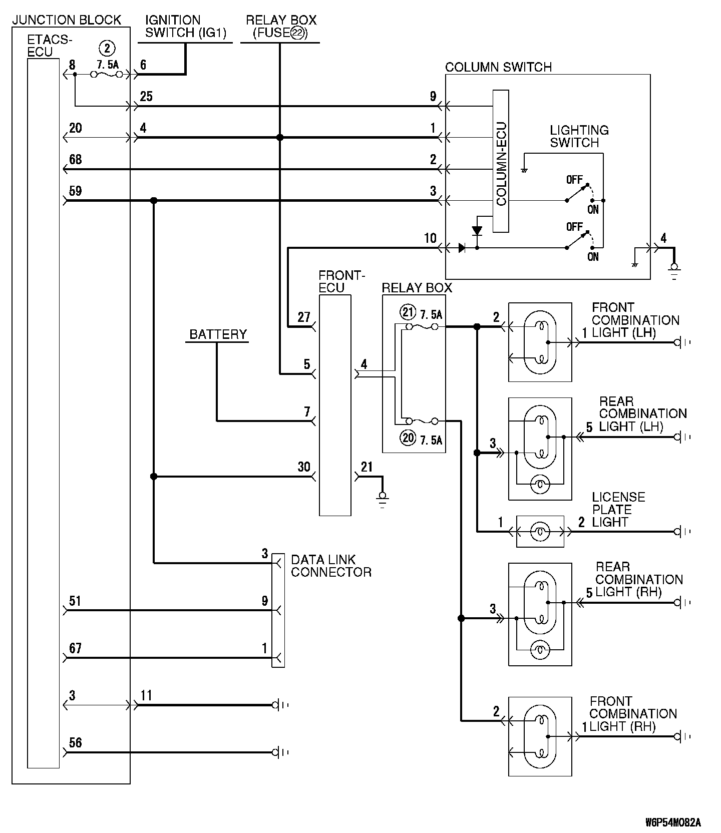 If the column switch sends a taillight switch "ON" signal to the front-ECU, the front-ECU turns on its taillight relay, causing the taillights to illuminate.