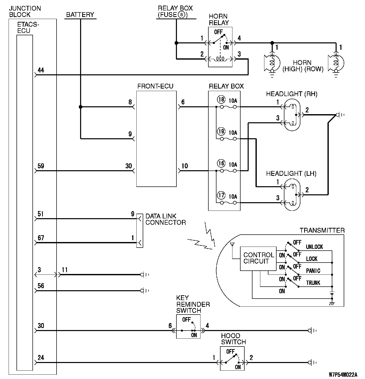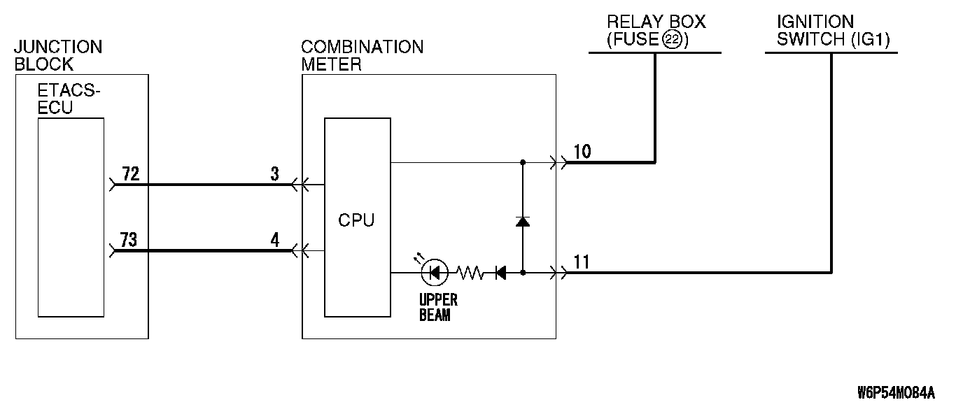 At the same time that the high-beams are illuminated, the ETACS-ECU sends a signal to illuminate the high-beam indicator via the CAN bus line. The combination meter receives the transmitted signal and turns the high-beam indicator on and off.