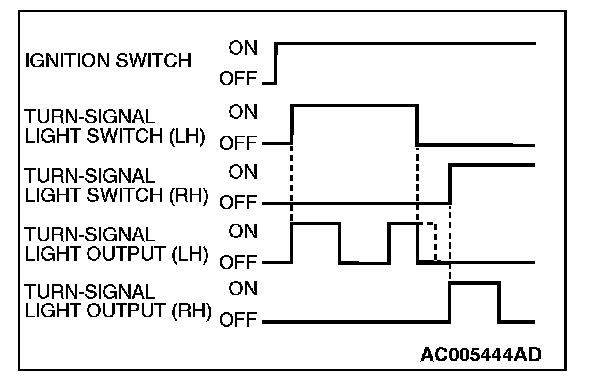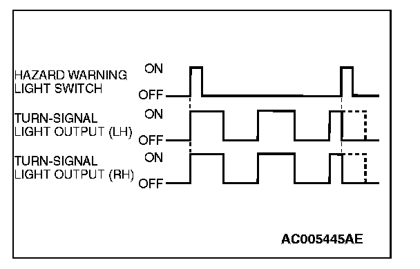 The turn-signal light output (flashing signal) is turned ON when the ignition switch is ON and the turn-signal light switch is ON (LH or RH). If the front or rear turn-signal light bulb has burned out, the flashing speed increases to indicate that the bulb has burned out.