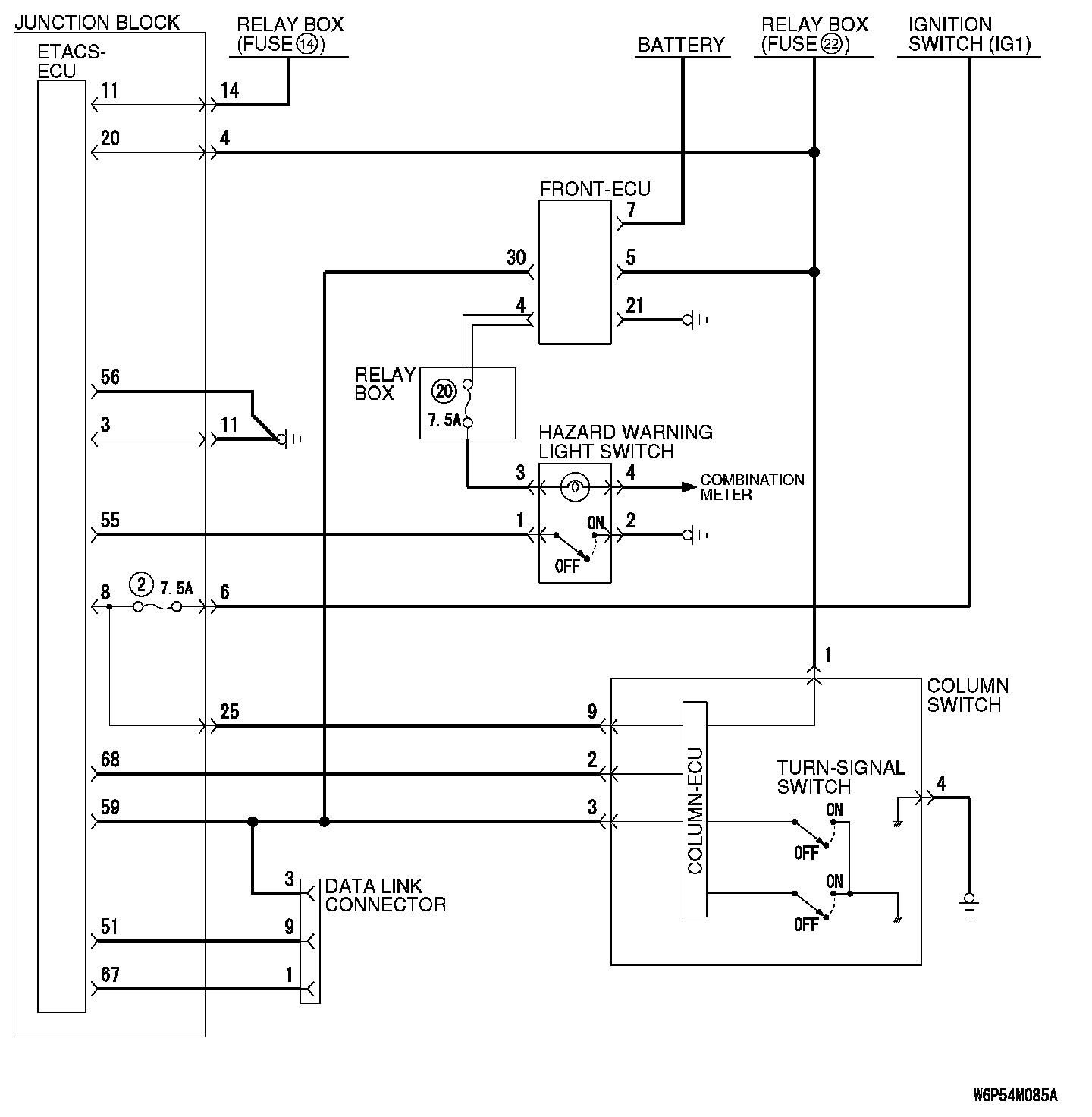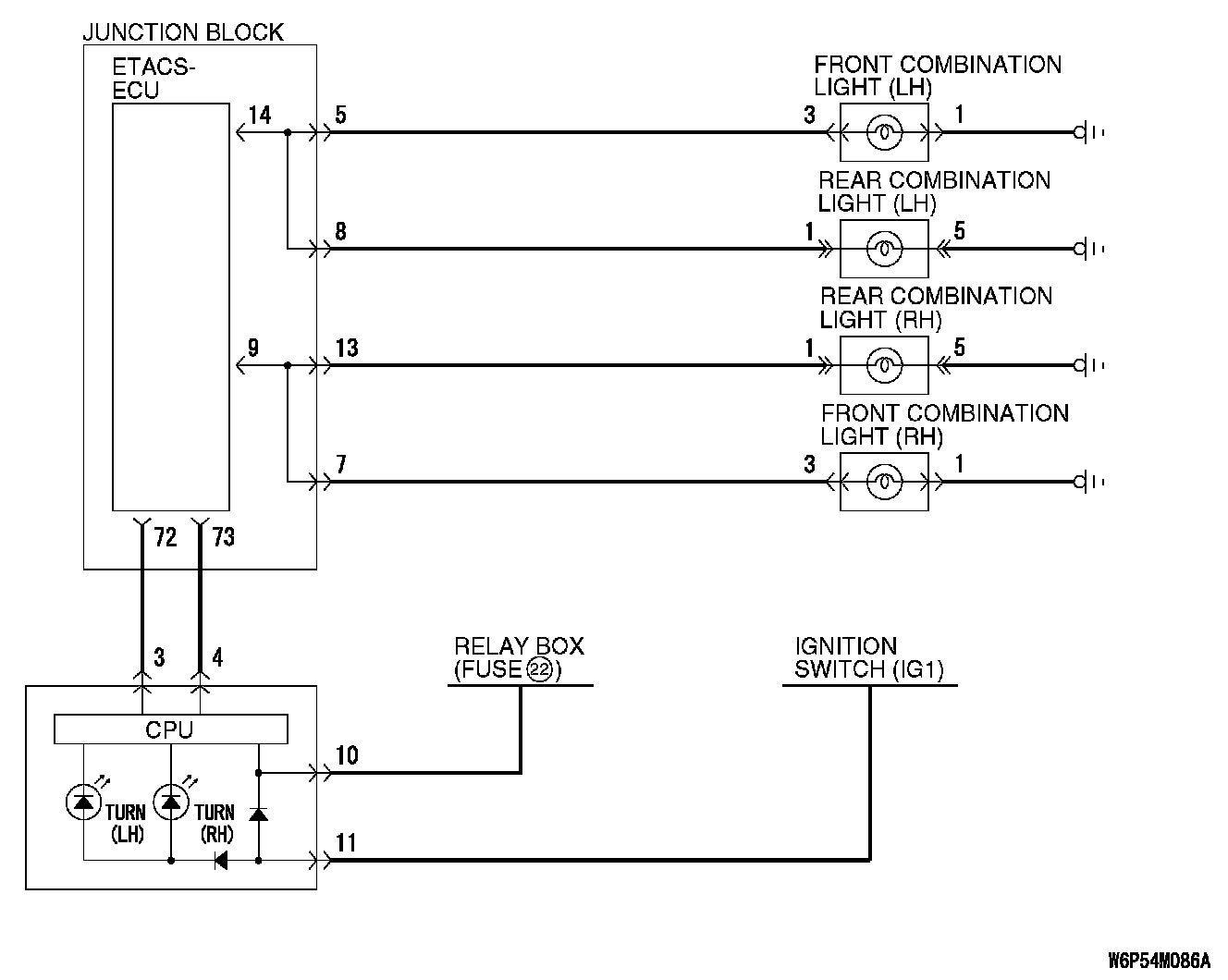 At the same time that the turn-signal lights are illuminated, the ETACS-ECU sends a signal to illuminate the turn-signal light indicator via the CAN bus line. The combination meter receives the transmitted signal and turns the turn-signal light indicator on and off.