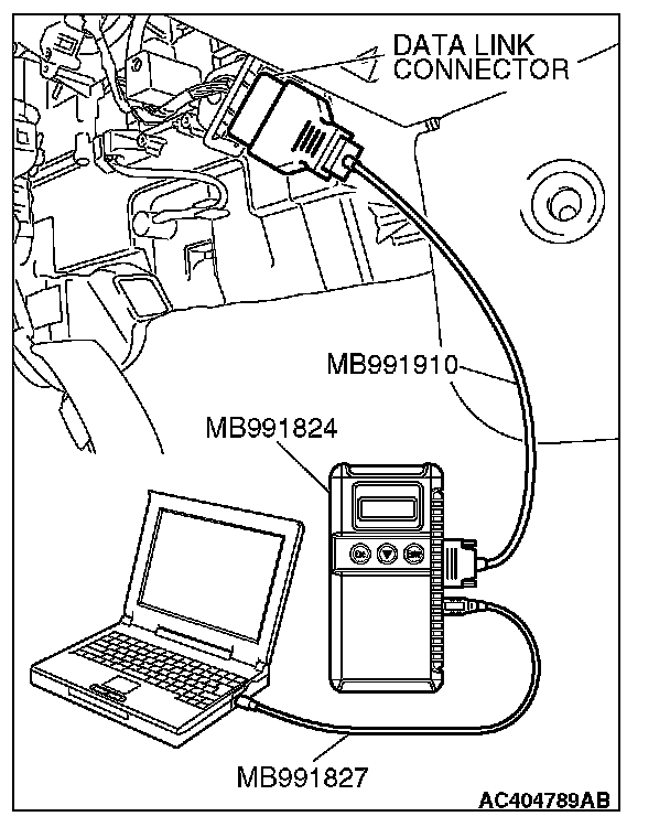 CAUTION: To prevent damage to scan tool MB991958, always turn the ignition switch to the "LOCK" (OFF) position before connecting or disconnecting scan tool MB991958.