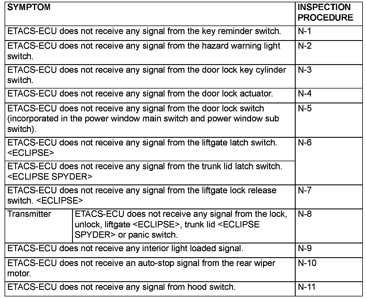 If a problem is found in the Data List inspection, observe the table.