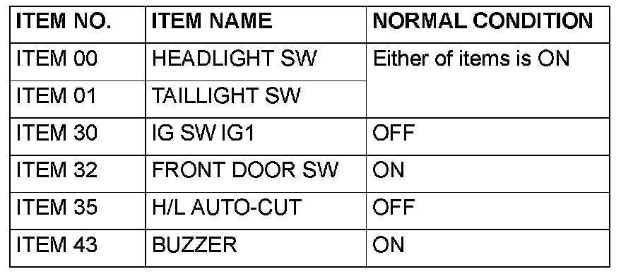 Q: Does scan tool MB991958 display "HEADLIGHT SW", "TAILLIGHT SW", "IG SW IG1", "FRONT DOOR SW", "H/L AUTO-CUT" and "BUZZER" as normal condition?