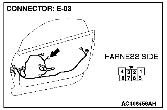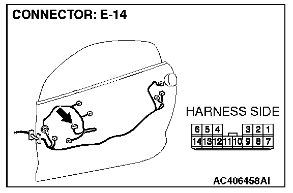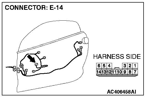 STEP 3. Check the wiring harness between power window main switch connector E-14 (terminals 10 and 11) and power window motor (RH) connector E-03 (terminals 3 and 8).