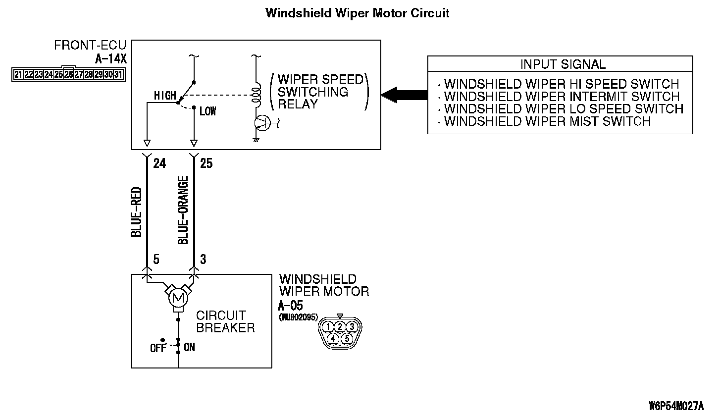 INSPECTION PROCEDURE G-2: Windshield Wiper and Washer: The windshield wipers do not work when the windshield wiper switch is at "INT" or "MIST" position or the windshield washer switch is at "ON" position. However, the wipers work at low speed when the windshield wiper switch is at "LO" or "HI."NOTE: This troubleshooting procedure requires use of scan tool MB991958 and SWS monitor kit MB991813. For details on how to use the SWS monitor, refer to "How to use SWS monitor."