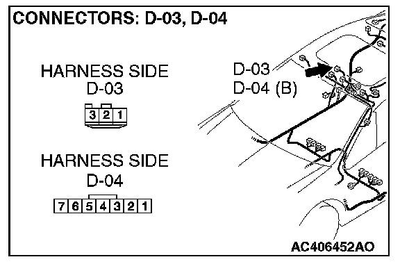 STEP 3. Check the wiring harness between front dome light connector D-03 (terminals 1 and 3)