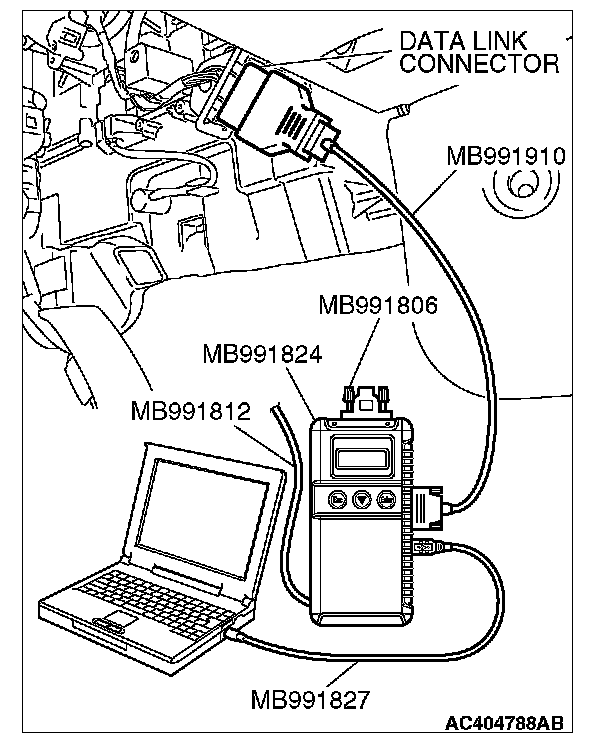 CAUTION: To prevent damage to scan tool MB991958, always turn the ignition switch to the "LOCK" (OFF) position before connecting or disconnecting scan tool MB991958. Connect special tool MB991910 before connecting special tool MB991812. Be sure to connect special tool MB991806 after turning on special tool MB991824.
