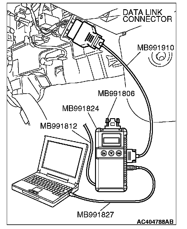 CAUTION: To prevent damage to scan tool MB991958, always turn the ignition switch to the "LOCK" (OFF) position before connecting or disconnecting scan tool MB991958. Connect special tool MB991910 before connecting special tool MB991812. Be sure to connect special tool MB991806 after turning on special tool MB991824.