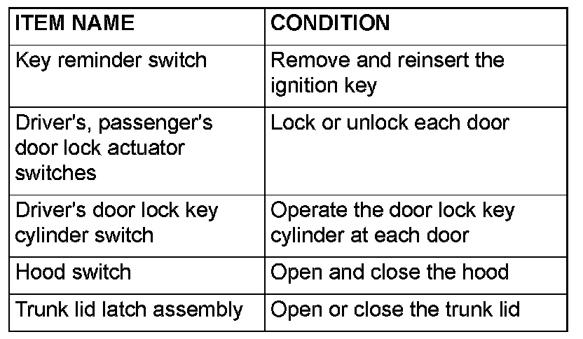 Q: When the key reminder switch, door lock actuator, door look key cylinder switch, hood switch, liftgate latch and glass hatch latch are operated, does scan tool MB991958 sound in all cases?