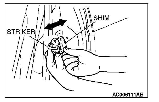 3. Adjustment by using shims (forward and rearward) Increase or decrease the number of shims so that the striker engages with the door latch properly.