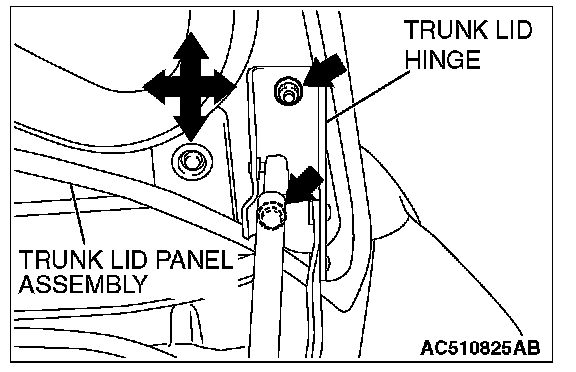 Loosen the trunk lid panel assembly mounting bolt and nut, and move the trunk lid panel assembly to make the clearance around the trunk lid even.