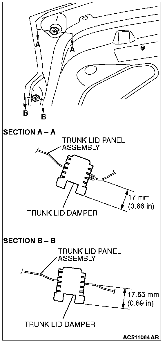 Turn each trunk lid damper to achieve the height shown in the drawing is reached. If the trunk lid panel height on one side is different from that on the other side (even after the trunk lid dampers have been adjusted to the height indicated in the drawing), turn the trunk lid damper(s) slightly to make fine adjustments to the trunk lid panel height.