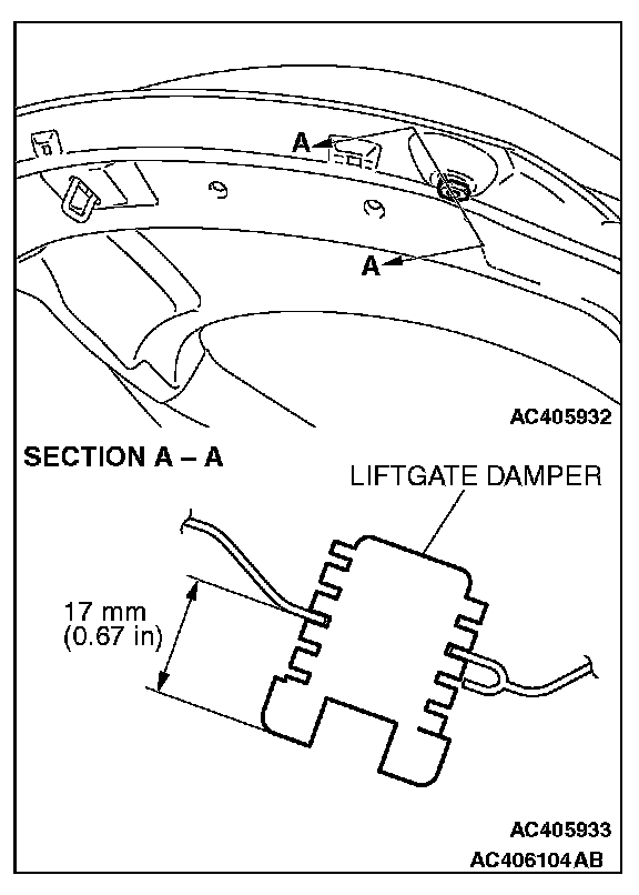 Turn the liftgate damper until the liftgate height is as shown. If the liftgate height is still not even at left and right sides, turn the liftgate damper further until the liftgate height is even. The lift-gate damper height is altered by roughly 3 mm (0.1 inch) when turning the liftgate damper one rotation.