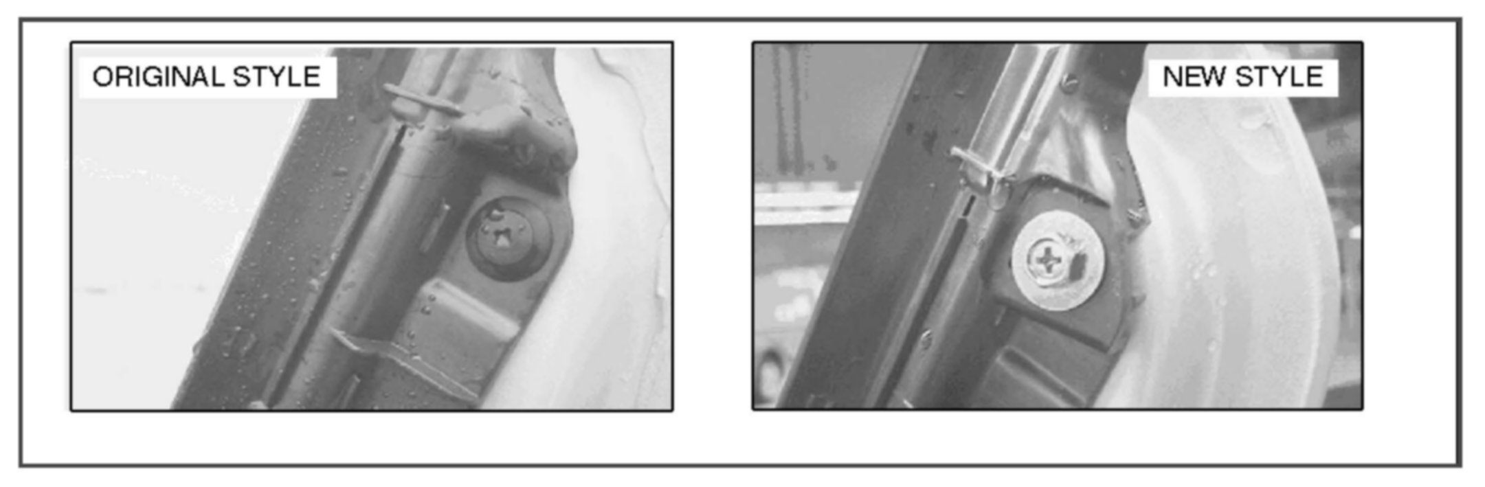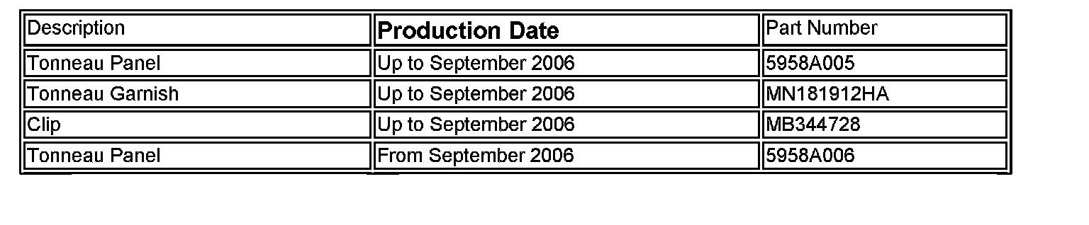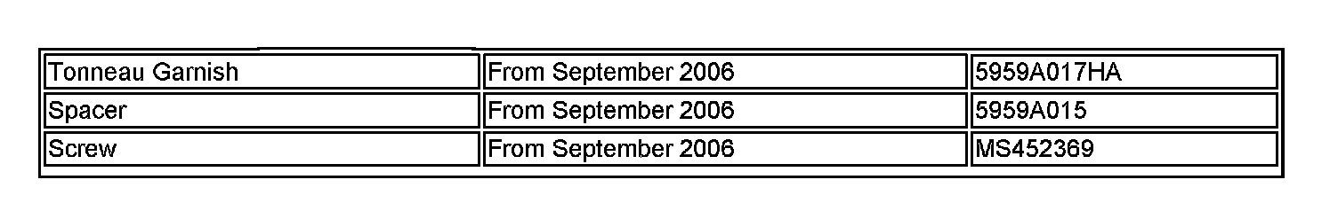 The forward attachment point on the tonneau panel and garnish have been changed on vehicles produced after September 13, 2006 to improve rigidity of the part. The original attachment utilized a push-pin clip while the current method is a screw and spacer attachment.