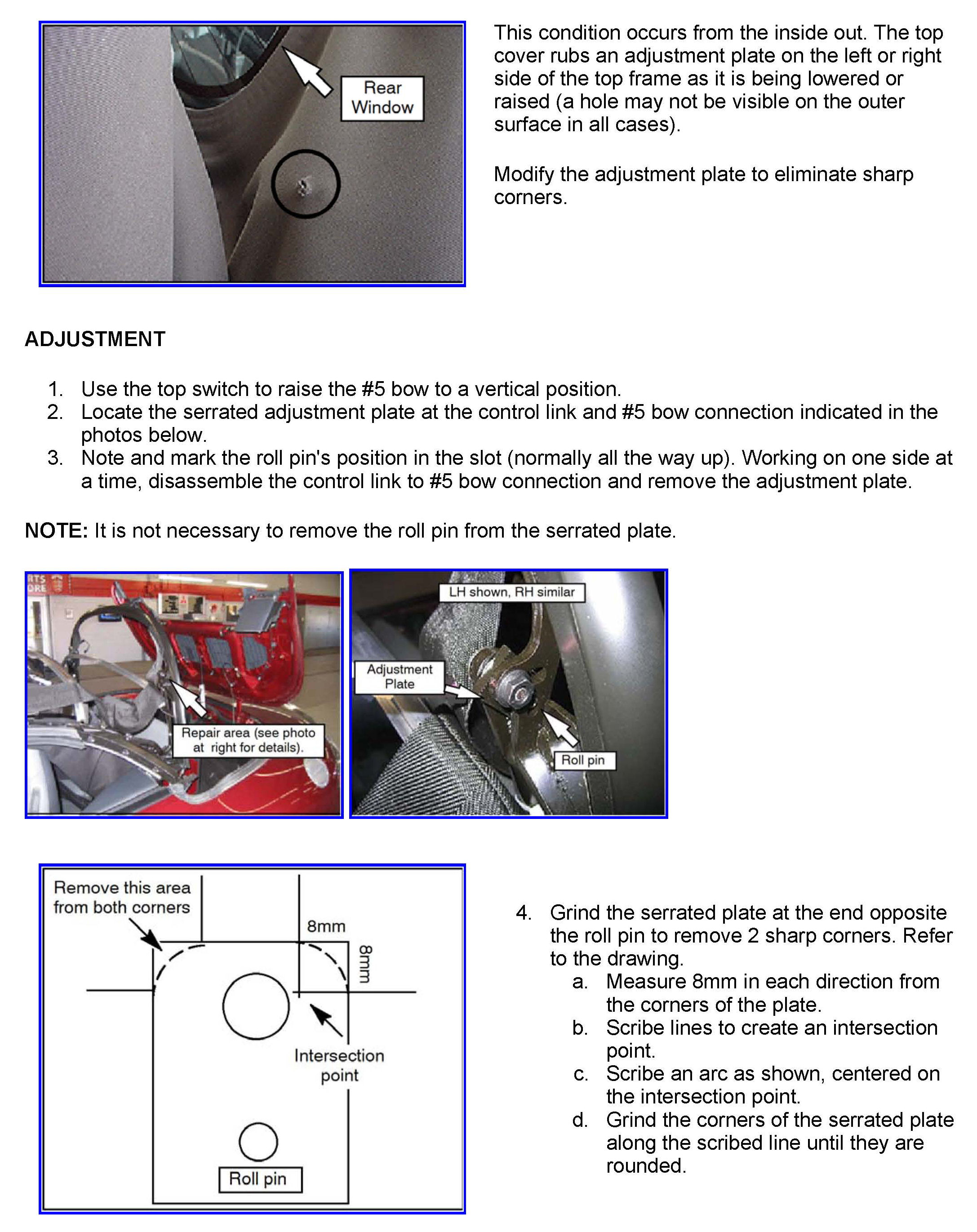 This bulletin is supplied as technical information only and is not an authorization to repair. Repairs should only be made in conjunction with a convertible to cover replacement. If an affected vehicle is observed with the described condition diagnose the condition repair as described in this bulletin and submit a normal warranty claim using the following information.