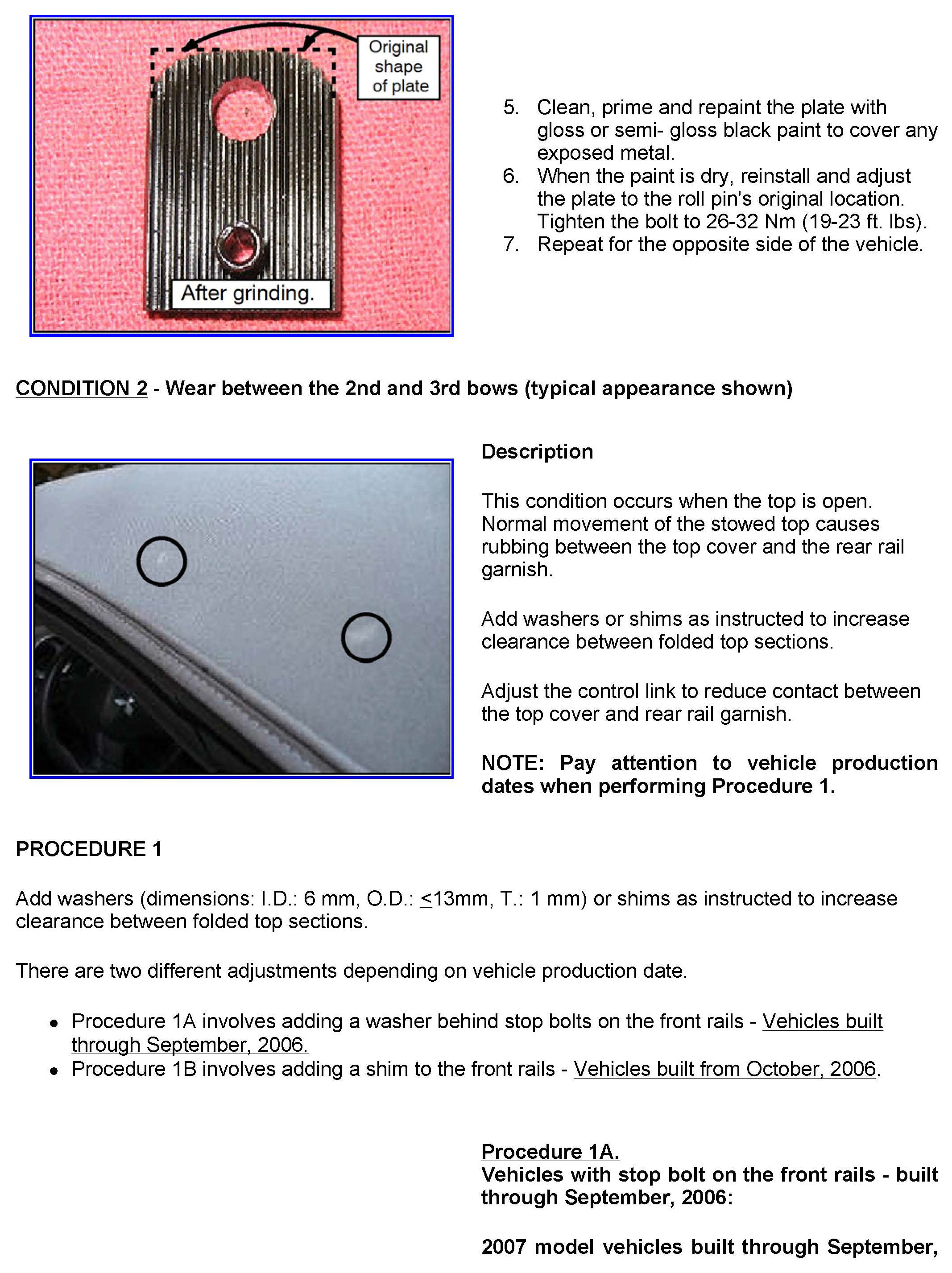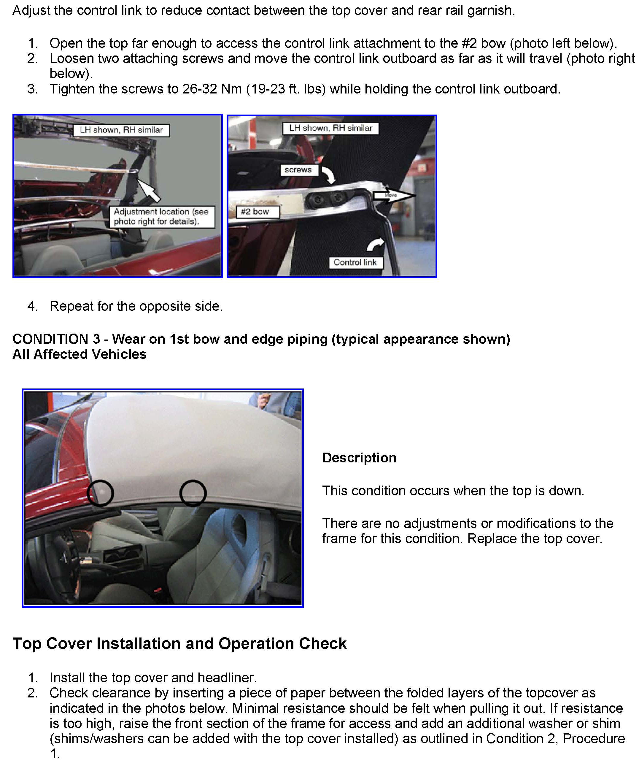 Convertible top covers on some affected vehicles may exhibit wear at points of contact with the top frame. This occurs when sections of the stowed top rub against each other as the vehicle is driven or when the top is in operation. Wear usually occurs in the following areas: