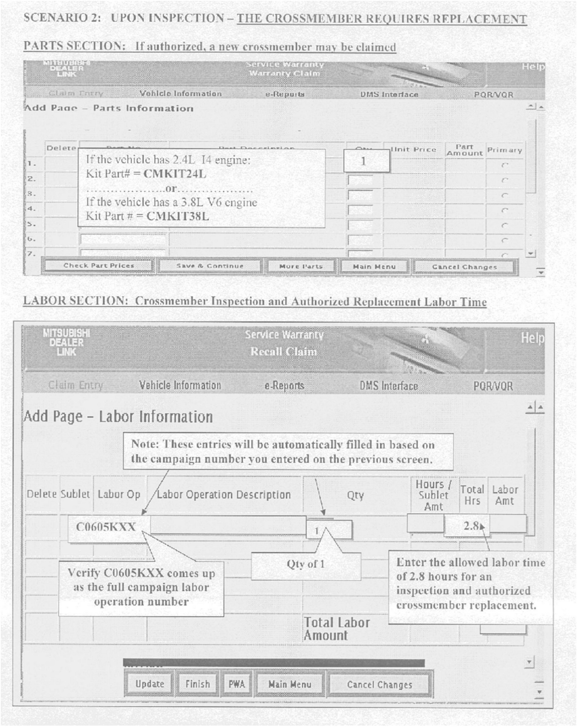 A letter will be sent to all owners of affected vehicles telling them to bring their vehicle to their Mitsubishi Motors dealer to have the crossmember inspected and replaced if needed. A copy of the customer notification letter appears later in this bulletin.