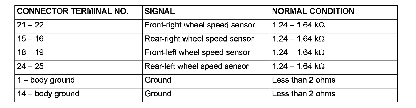 2. Check the resistance and continuity between the terminals indicated in the table below.