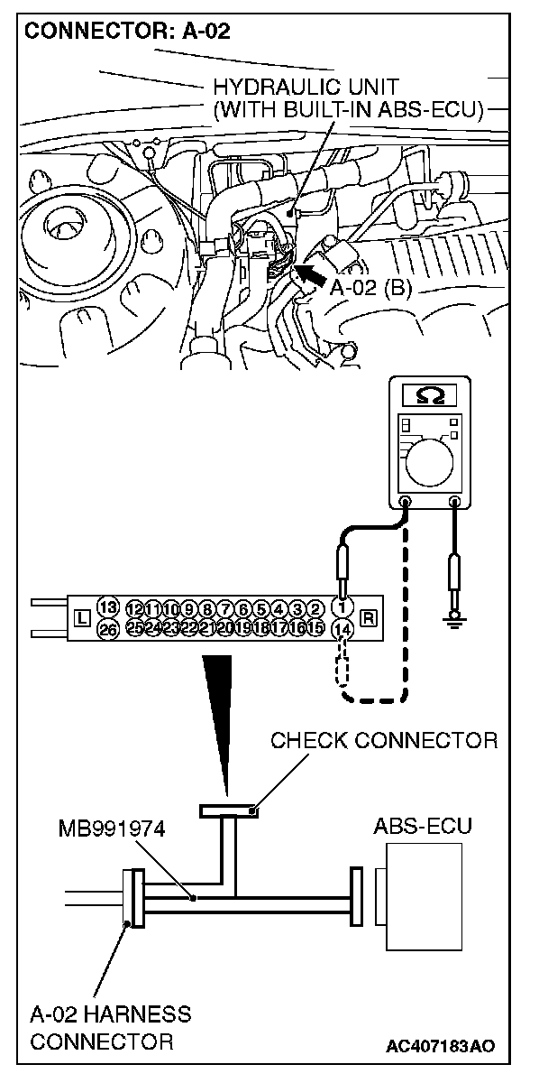 (1) Disconnect the connector A-02, and connect special tool MB991974 to the wiring harness-side connector.
