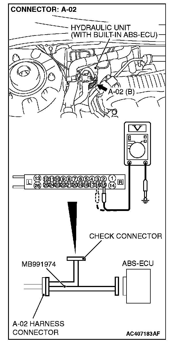 2. Disconnect the ABS-ECU connector A-02, and then use special tool MB991974 to measure the output voltage at the harness side connector.