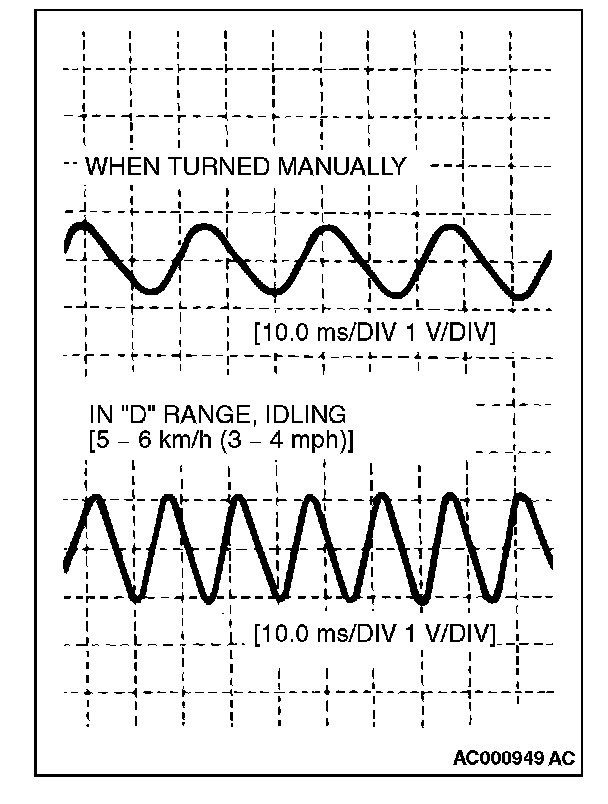 NOTE: The output waveform is low when the wheel speed is low. Similarly, it will be higher as the wheel speed increases. Waveform may also be observed by driving the vehicle.