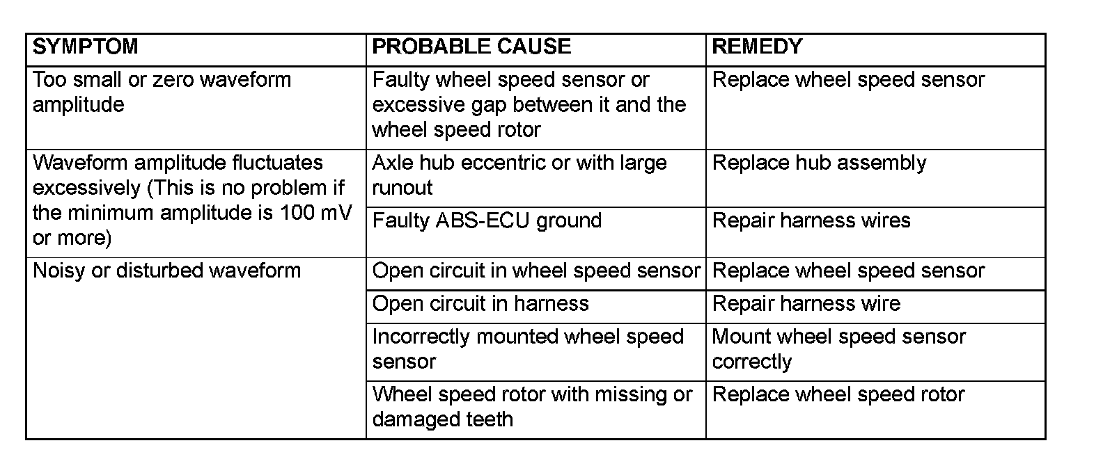 NOTE: The wheel speed sensor cable moves in relation to motion of the front or rear suspension. Therefore, it is likely that it has an open circuit only when driving on rough roads but it functions normally when driving on smooth roads. It is recommended to observe sensor output voltage waveform also under special conditions, such as driving on a rough road.