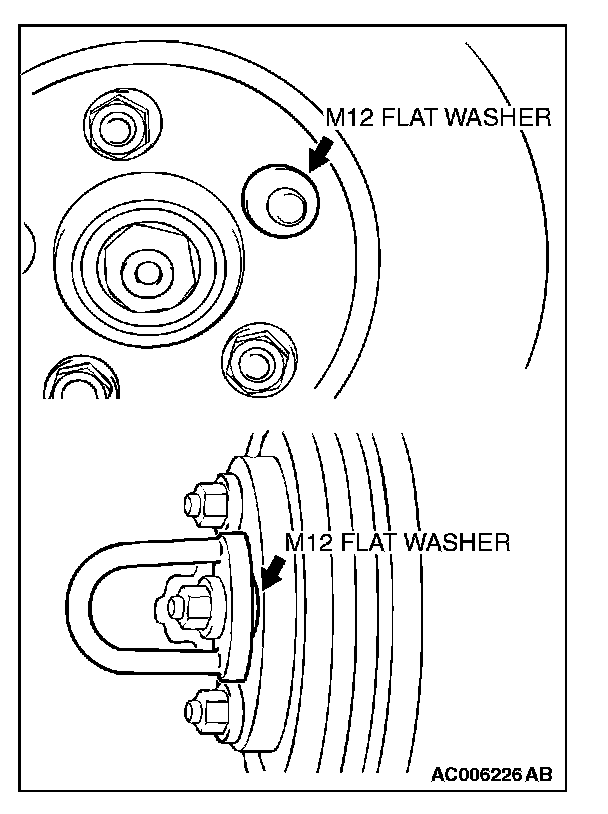 ^ When the on-the-car type lathe is used, first install a M12 flat washer on the stud bolt in the brake disc side according to the figure, and then install the adapter. If the adapter is installed with M12 flat washer not seated, the brake disc rotor may be deformed, resulting in inaccurate grinding.