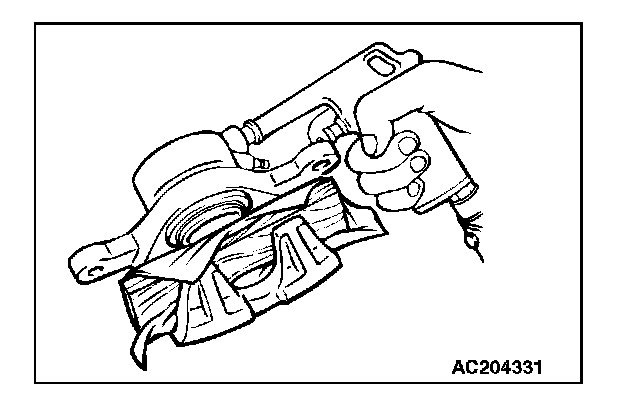 Place a piece of wood, etc. against the caliper body as shown. Blow compressed air through the brake hose connection hole to remove the piston boot and piston.