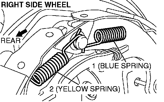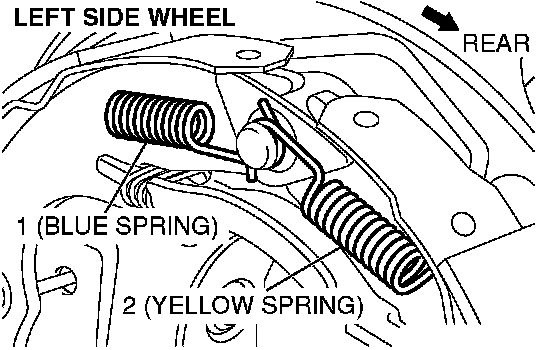 CAUTION: The front and rear shoe-to-anchor springs are not interchangeable, so the blue spring must be installed at the front side and the yellow spring must be installed at the rear side.