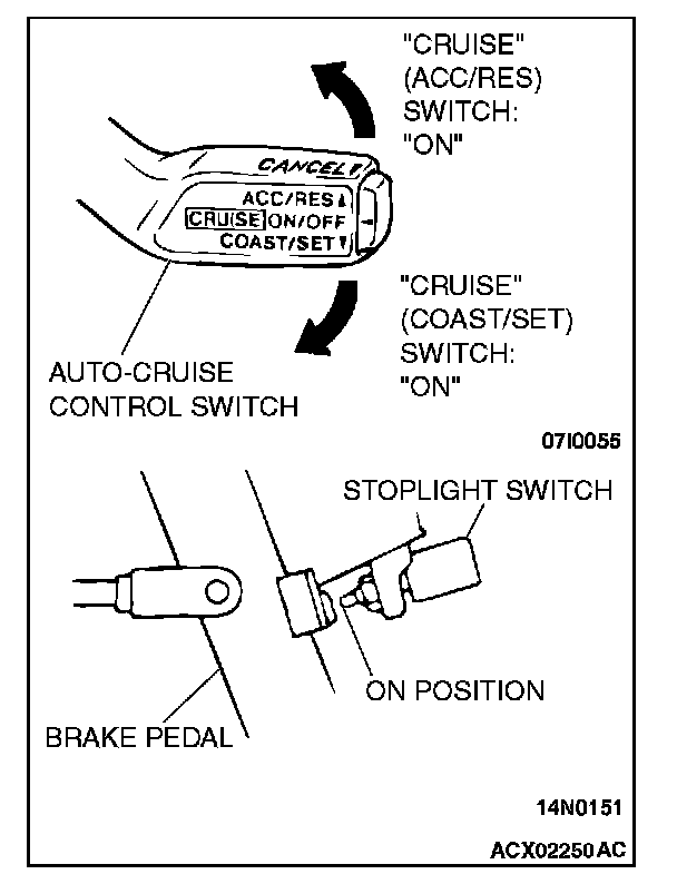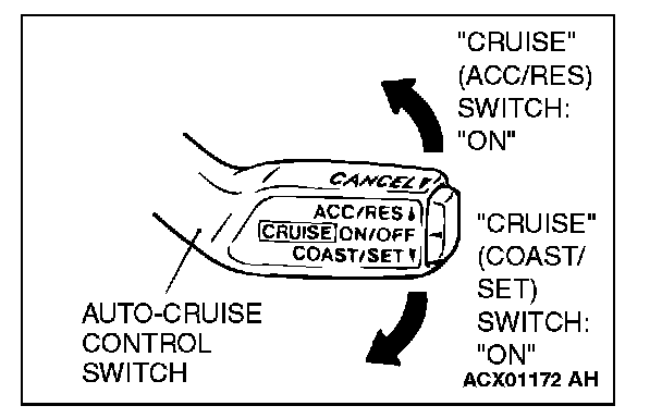 1. Turn the ignition switch to the "ON" position while holding the auto-cruise control switch down to the "COAST/SET" position. Then, within one second, more the cruise control switch up to the "ACC/RES" position.