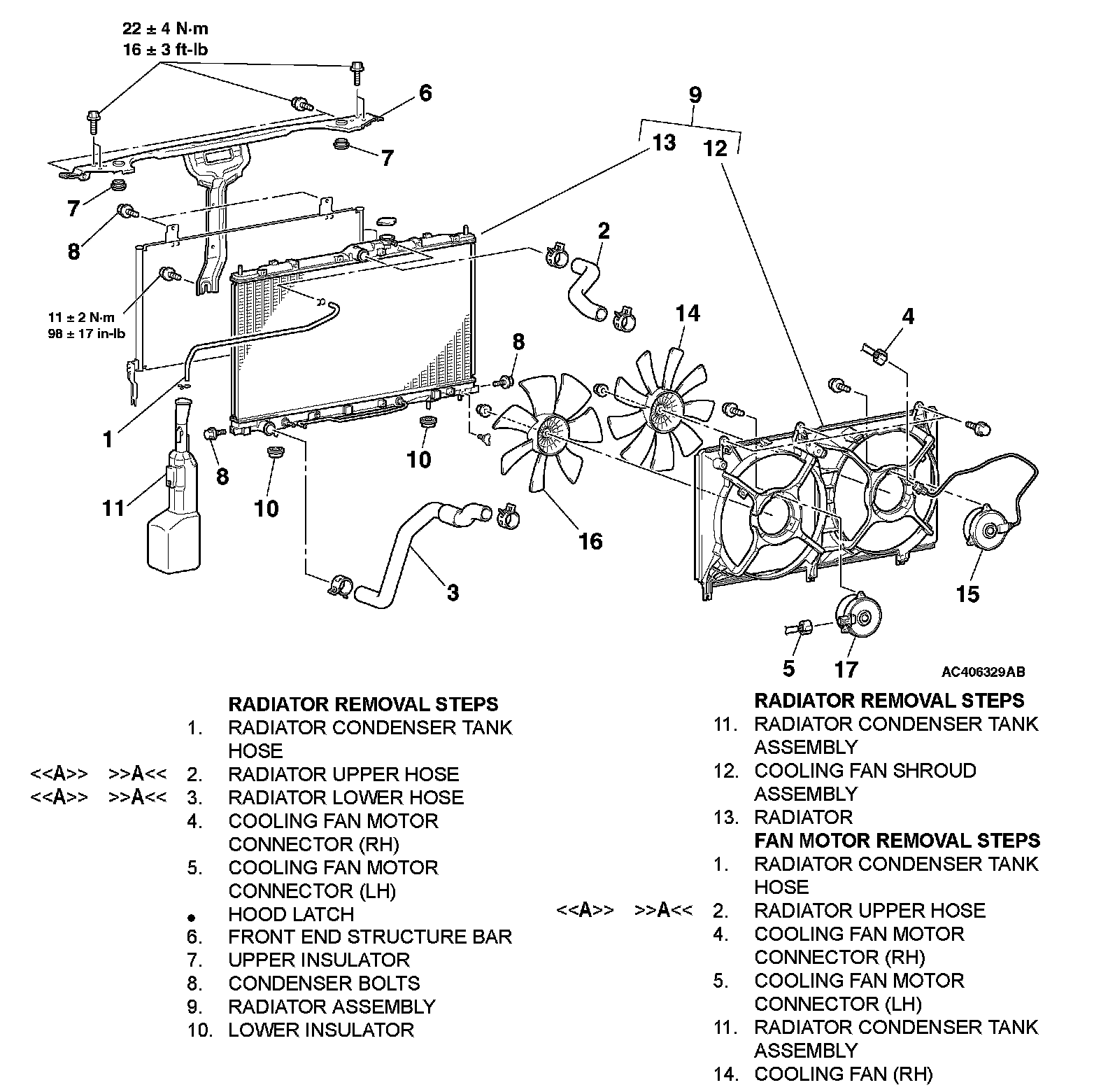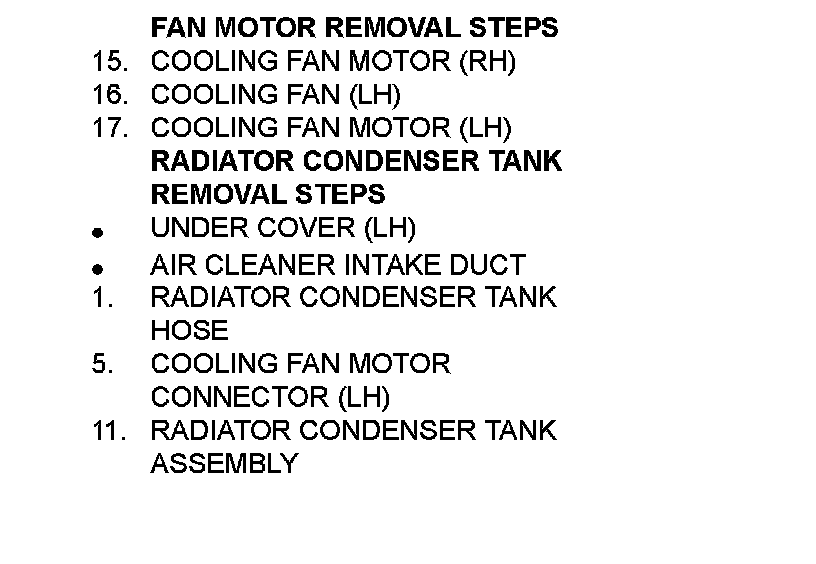 Fan Motor, Radiator Condenser Tank Removal Steps 15-17, 1-11: