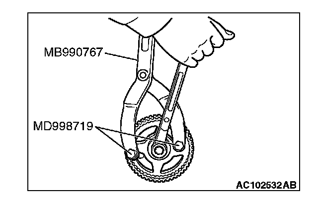 1. Hold the camshaft sprocket with special tools MB990767 and MD998719.