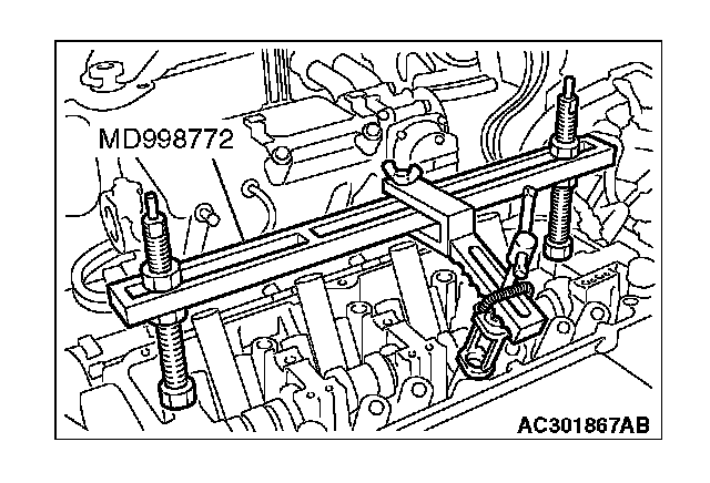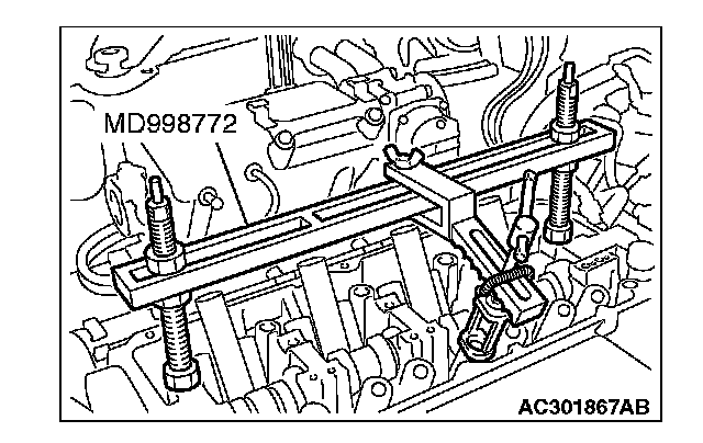 Use special tool MD998772 to compress the valve spring and then remove the valve spring retainer locks.